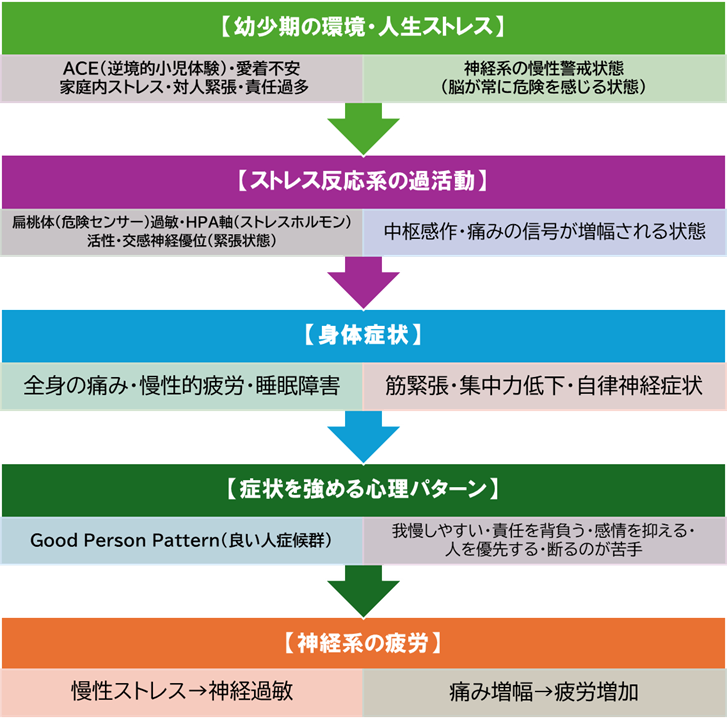 線維筋痛症は長い間「原因不明の痛み」と扱われてきましたが、近年はACE(逆境的小児体験:Adverse Childhood Experiences)や愛着トラウマとの関連が多くの研究で示唆されています。 臨床現場では、神経系の発達・ストレス反応系・痛覚調整系の観点から理解すると非常に整理しやすくなります。