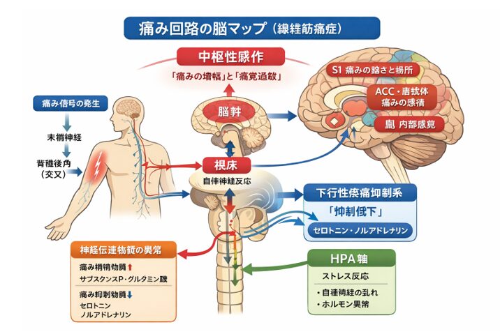 このような状態が長く続くと、脳が「危険を感じやすいモード」に固定され、身体の痛みの信号を過敏に感じ取るようになります。線維筋痛症では、この状態を中枢感作(Central Sensitization)と呼びます。つまり、線維筋痛症は単なる身体の問題ではなく、長期的なストレスや神経系の過敏化が関係している可能性がある症状と理解されています。
