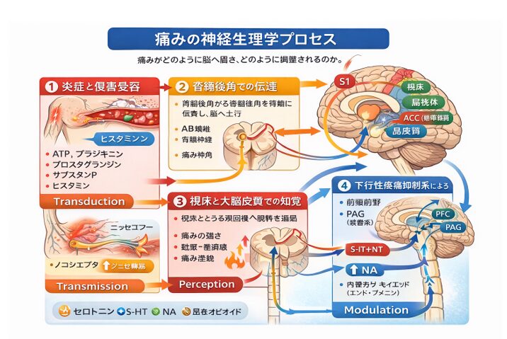 痛みの神経経路は単純な信号伝達ではなく、次のような多段階プロセスによって成立しています。